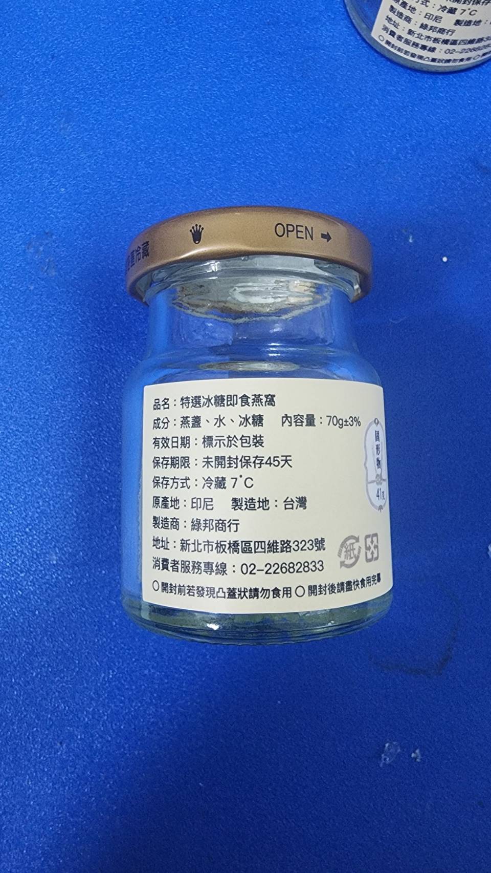 成份:燕盞、水、冰糖 *未開封保存45天(需冷藏7°C、不含防腐劑及化學加工) 原產地:加里曼丹 製造商:綠邦商行